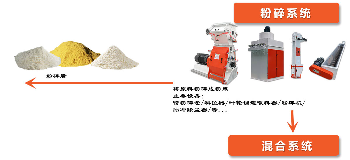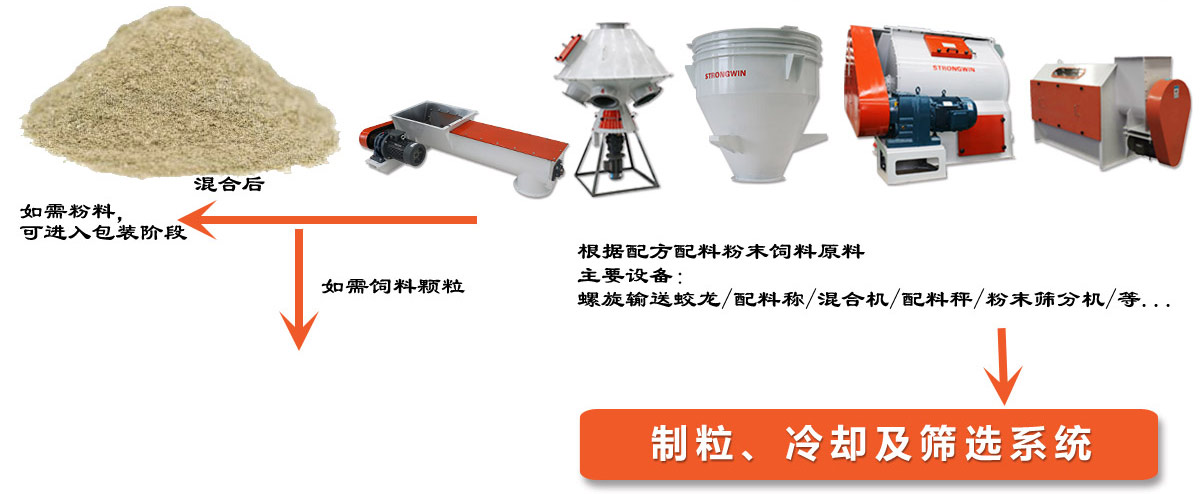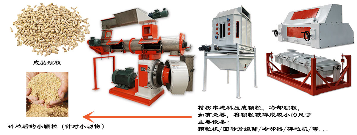 粉碎機→混合機→制粒機→逆流冷卻器→碎粒機→分級篩→包裝機