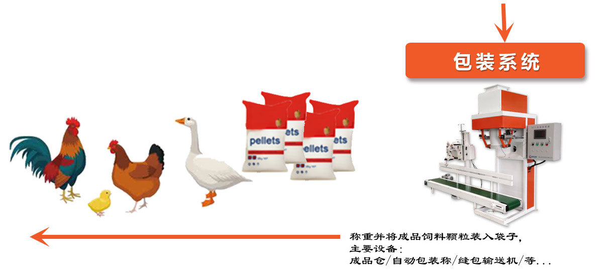 家禽飼料生產(chǎn)線主要包括原料接收和清洗系統(tǒng),破碎系統(tǒng),配料和混合系統(tǒng),制粒系統(tǒng),冷卻系統(tǒng),篩分系統(tǒng)和成品包裝系統(tǒng)。